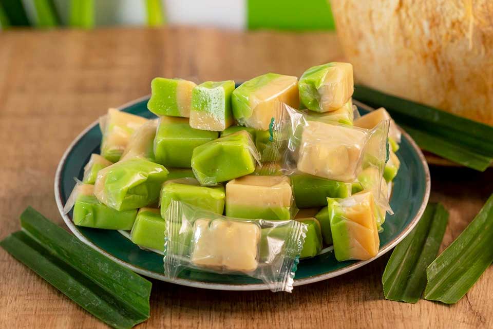 Thành phần chính của Kẹo Dừa không đường bao gồm nước Cốt Dừa Non và Mạch nha nếp và Lá dứa và hoàn toàn không thêm đường.